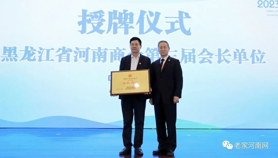 河南省豫商联合会会长钱国玉为黑龙江省河南商会第三届会长王国建授牌