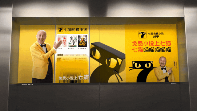 短短15秒内,七猫、免费、网文等品牌标志性信息反复出现,穿插在代言人腾格尔魔性的“喵喵喵”之中,在极短时间内抓住受众关注,配上梯影的超大屏幕和绝佳视听效果,博得受众会心一笑的同时,直击用户心智。