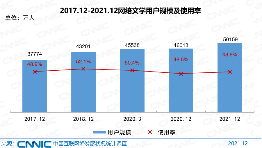 CNNIC《中国互联网络发展状况统计调查》报告显示,2021年底我国网络文学用户规模突破5亿,占中国网民整体的48.6%,并常年维持在50%上下。