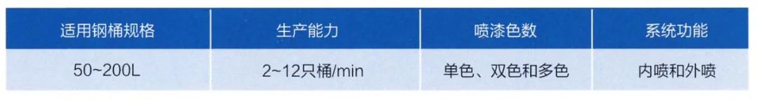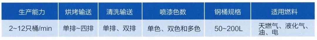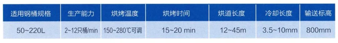 该产品主要是50-220升钢桶进行内外清洗、脱水、烘干、内外喷漆、烤漆固化、冷却、印字的自动生产流水线,可根据用户要求设计高速、中速、低速三种生产能力的设备。产品结构合理、工艺先进美观大方、操作维护方便。