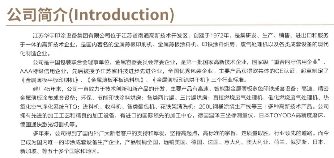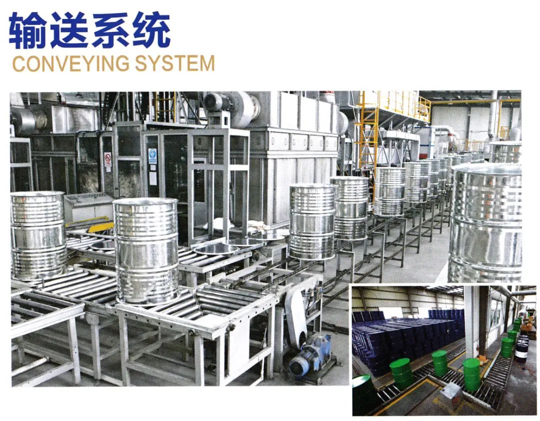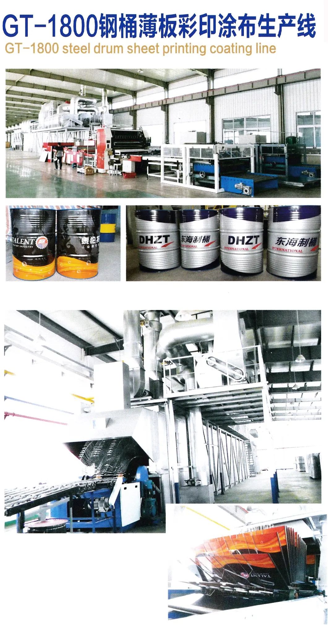 印刷生产线:钢桶薄钢板采色印刷主要适用于200升钢桶定尺基板材料外表面印刷各种文字图案,基板材料必须是无油板。印刷油墨为UV油墨。设备主要用于钢桶蔳板表面彩印烘干,全线主要由进料装置、输送、印刷机、检测台、UV烘房、冷却、卸料、堆积、电气控制等组成。涂布生产线:钢桶薄板留空涂料主要适用于200升钢桶定尺基板材料外表面打底、印刷后上光,也可以钢桶内涂,钢桶外面条形双色涂布、基板材料必须是无油板。设备主要用于钢桶薄板表面涂布烘干,全线主要由进料装置、输送、涂料机、检测台、上料装置、烘房、冷却、卸料、堆积、电气控制等组成。主要加热能源可适用电、石油液化气、天然气等。
