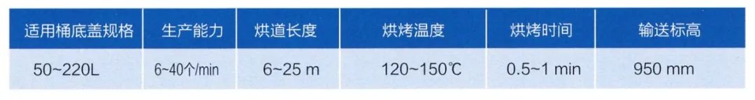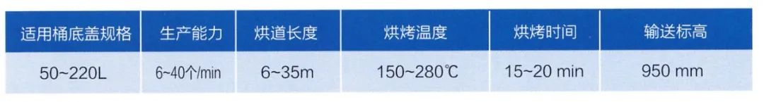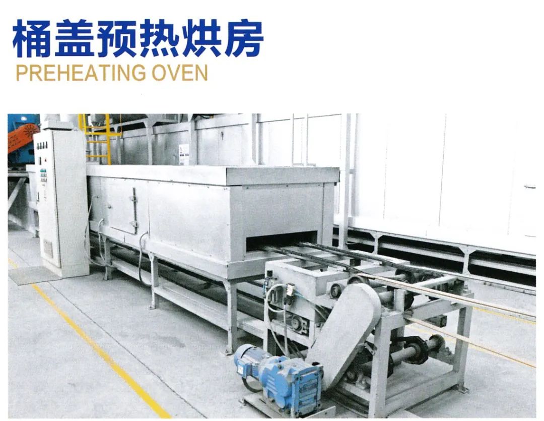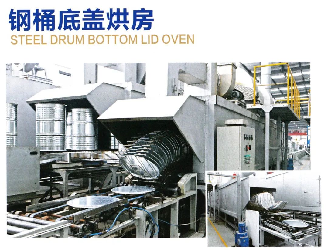 该产品主要对50-220升钢桶的底和盖清洗和喷漆后烘干,可以对不同的用途和不同的要求另行设计,输送形式为花铁架支撑立式平移输送,其特点主要是结构紧凑、体积小、生产能力高,能源消耗低。主要由前输送、前传动、烘道本体、前排风装置、加热装置、后排风装置、冷却、后传动、后输送、电气控制系统等组成。加热方式可采用天然气、液化气、电、油、燃煤热风炉等。