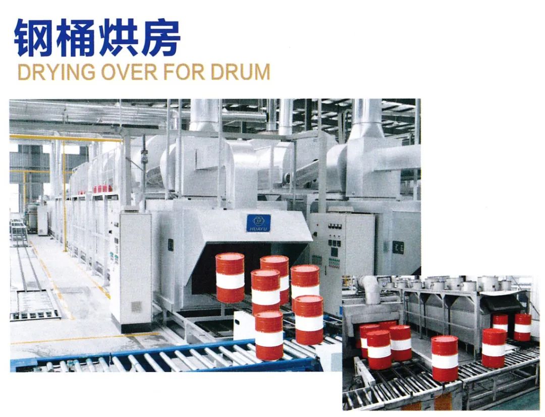 该产品主要对50-22升钢桶清洗和喷漆后烘干,可以对不同的用途和不同的要求另行设计,主要由前分配、前传动、烘道本体、前排风装置、加热装置、后排风装置、冷却、后传动、后分配、电气控制系统等组成。加热方式可采用天然气、液化气、电、油、燃煤热风炉等。输送形式为立式输送,可根据主生产能力分单排、双排、三排及四排输送。温度可根据工艺要求设定,可对钢桶清洗烘干、也可以对内喷和外喷烘干。