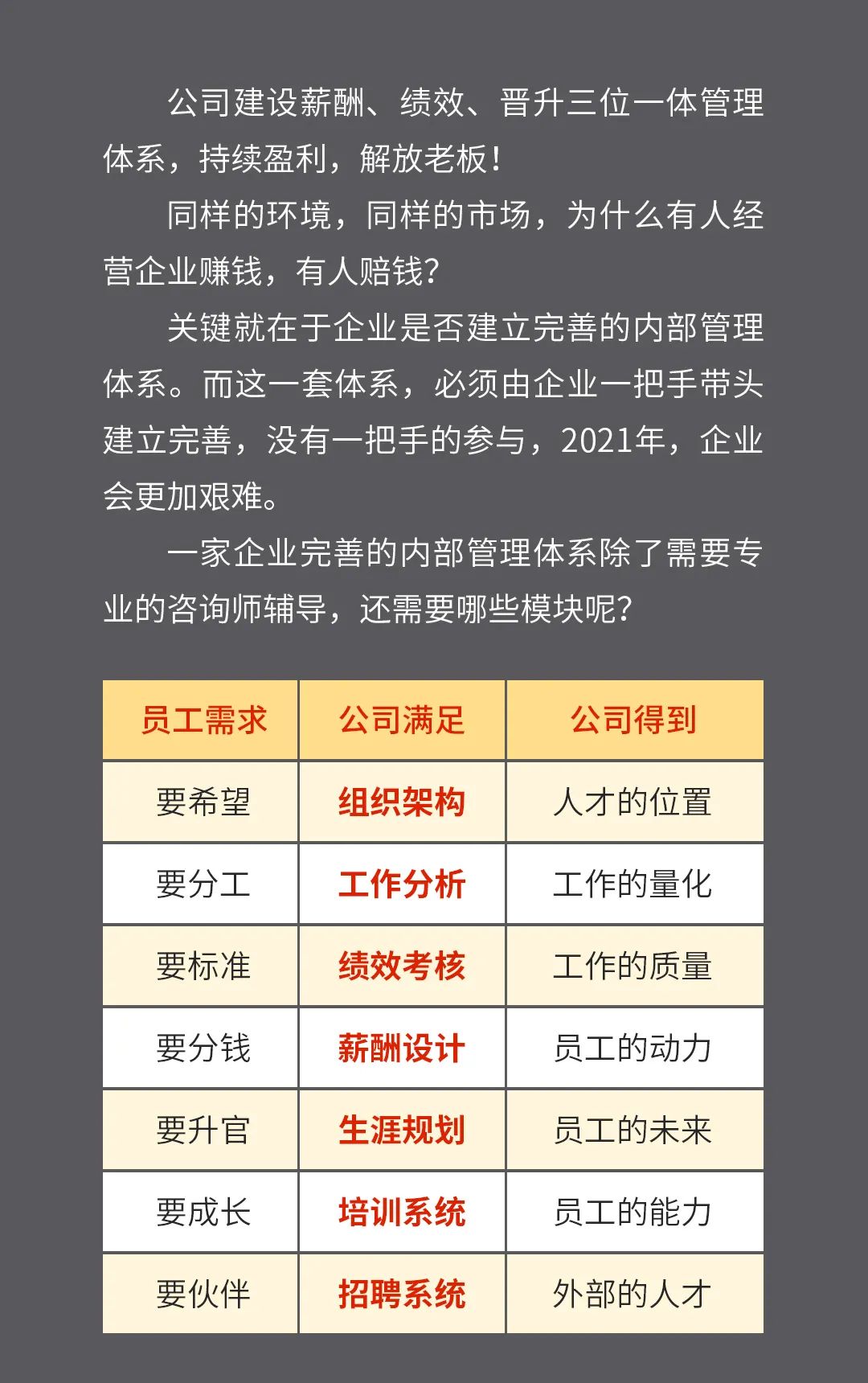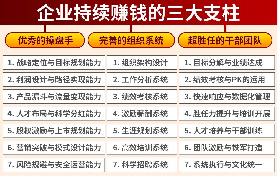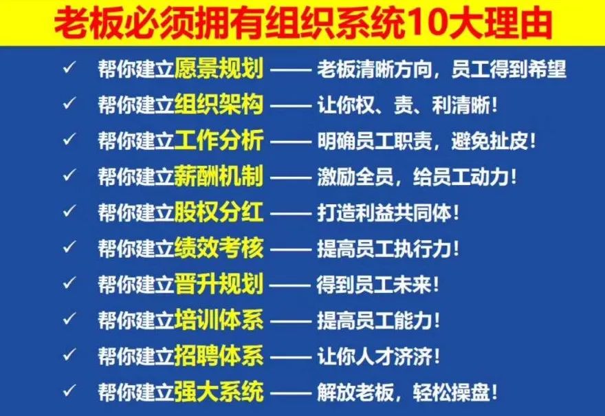 将成型的业务流程教给员工、将成体系的管理制度导入团队、用操盘的思维去经营企业!把自己从企业中解放出来,老板才能站在更高的层次去与市场博弈!