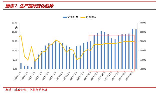 然后,母猪种群生产效率显著改善。从窝均健仔数、配种分娩率等指标看,2022年2月至2023年2月区间的母猪种群生产效率同比有显著提升(涌益样本MSY:2021年为17.39,2022年为18.16,2023年上半年为18.42)。