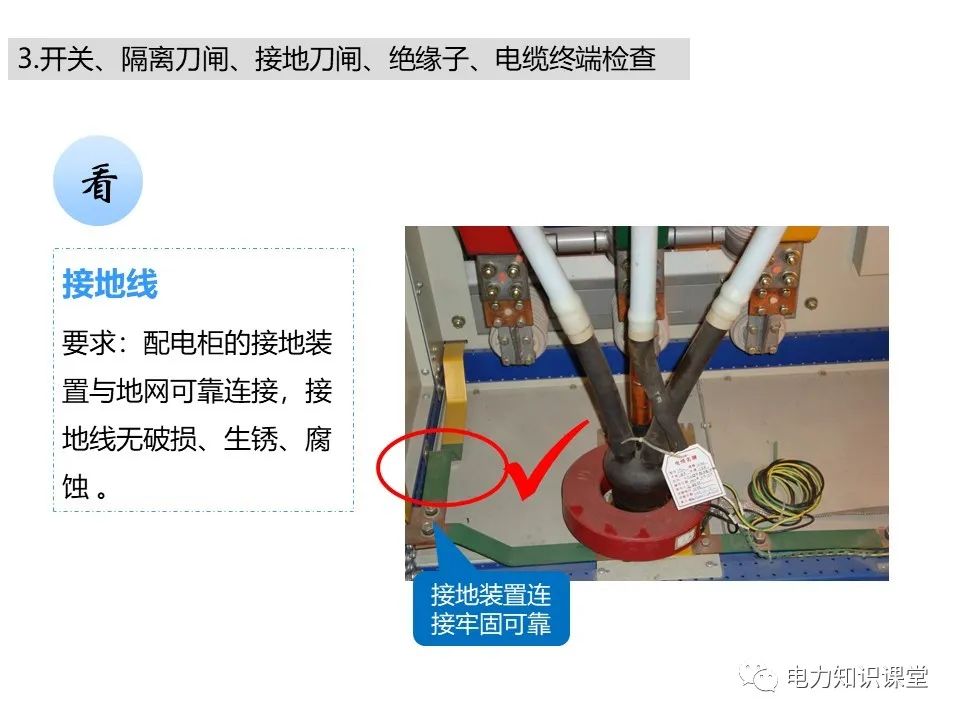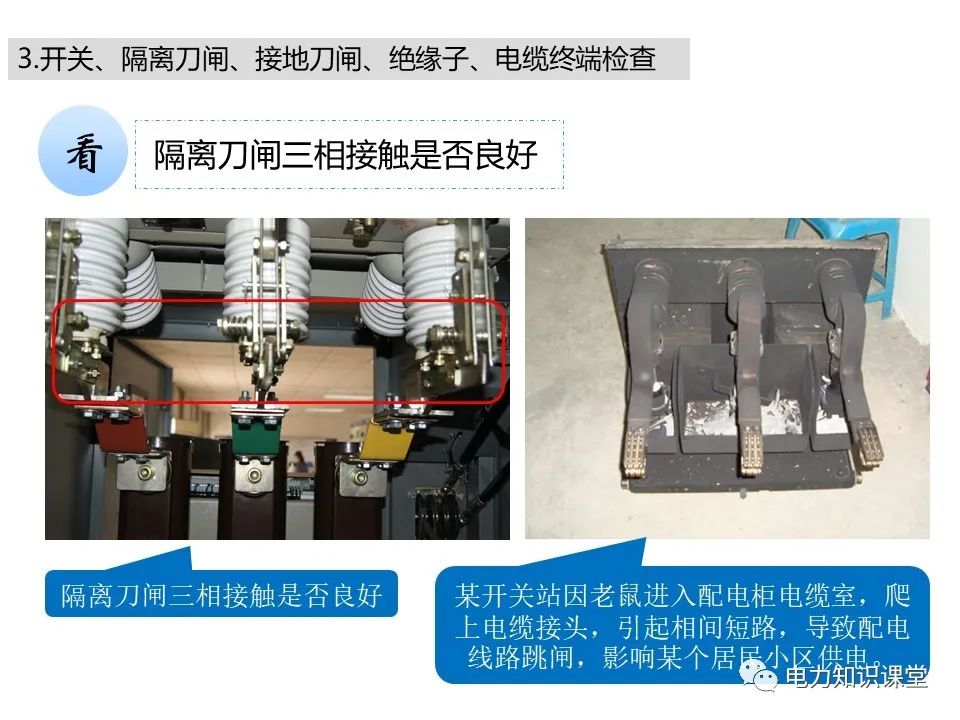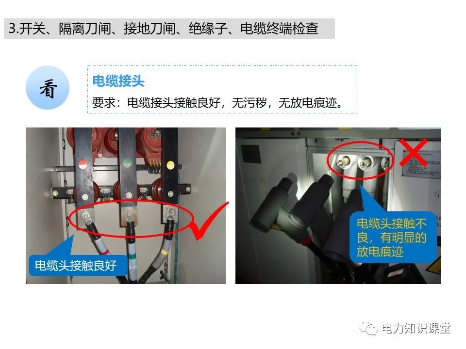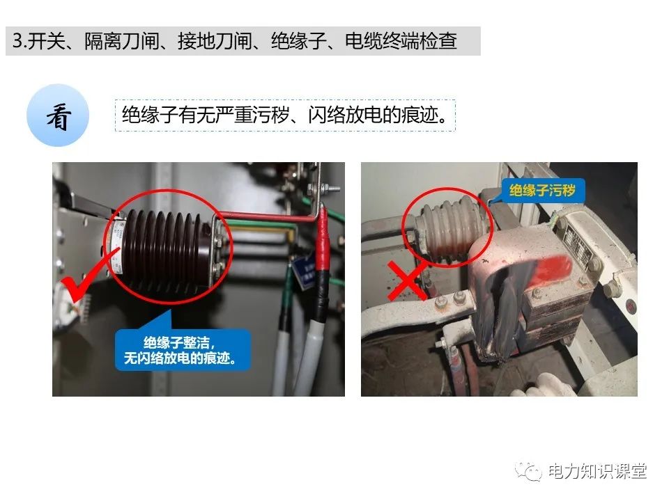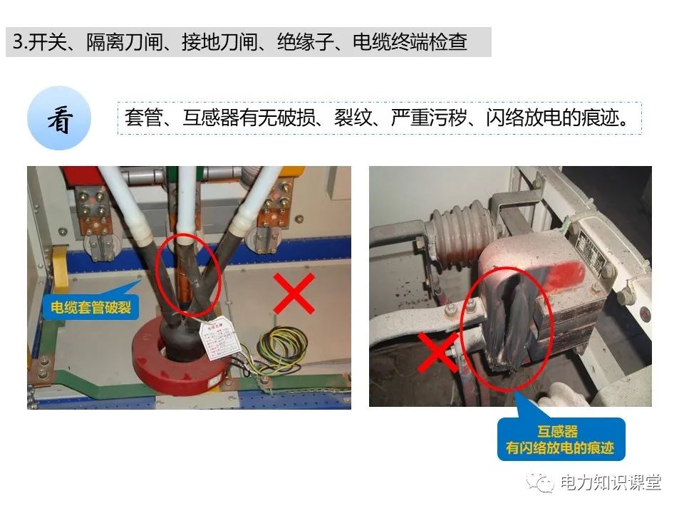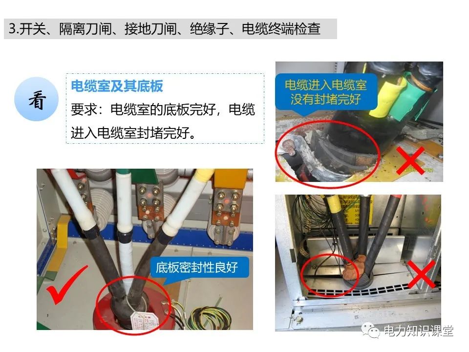l开关柜电缆室内套管及绝缘子有无破损、裂纹、严重污秽、闪络放电的痕迹;电缆出线口处的封堵是否严密,有无小动物进入痕迹。