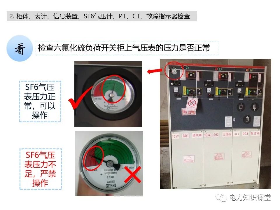 l六氟化硫负荷开关柜上气压表的压力是否正常。
