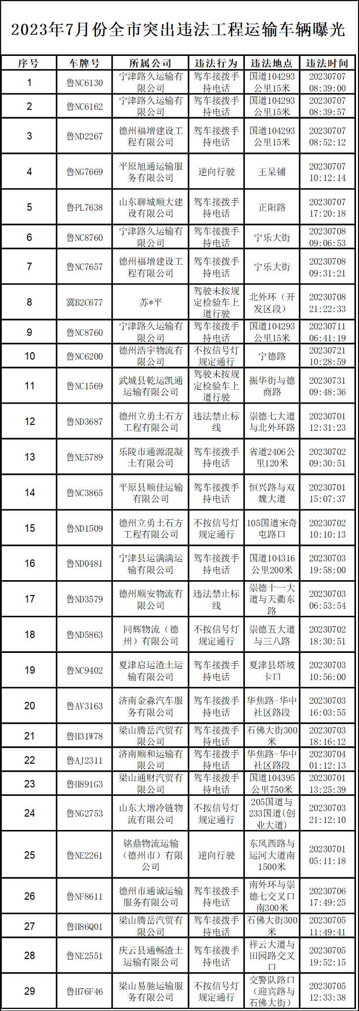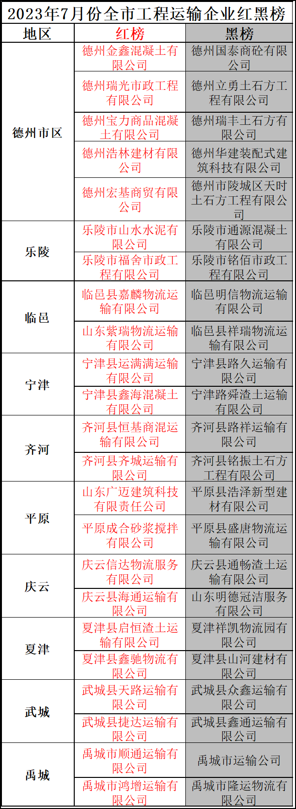 为进一步做好全市工程运输车辆源头管理和路面管控工作,督促工程运输企业落实安全生产主体责任,有效预防道路交通事故发生,公安交警部门根据7月份交通违法和交通事故情况对全市工程运输企业进行了分析统计,确定出23家交通安全管理良好的“红榜”企业和23家交通安全问题突出的“黑榜”企业。