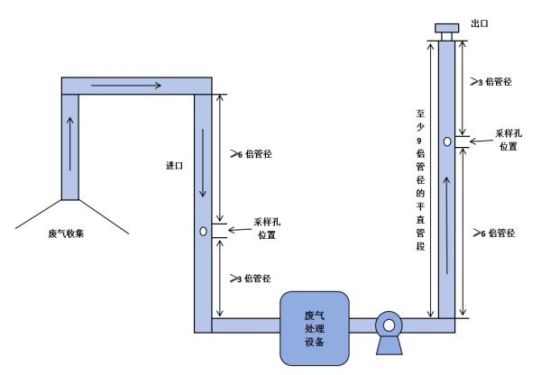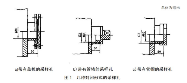 采样孔的内径不小于80mm,采样孔管长应不大于50mm。不使用时应用盖板、管堵或管帽封闭。对正压下输送高温或有毒气体的烟道,应用带有闸板阀的密封采样孔。对圆形烟道,采样孔应设在包括各测点内的互相垂直的直径线上。对矩形或方形烟道,采样孔应设在包括各测点在内的延长线上。