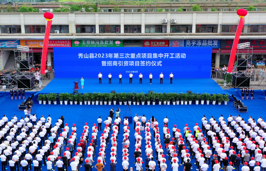 8月29日上午,秀山县举行2023年第三次重点项目集中开工活动暨招商引资项目签约仪式,共涉及项目56个,总投资167.39亿元。集中签约重大项目10个,总投资额88亿元,涉及农产品精深加工、新材料生产、智能制造等多个领域。