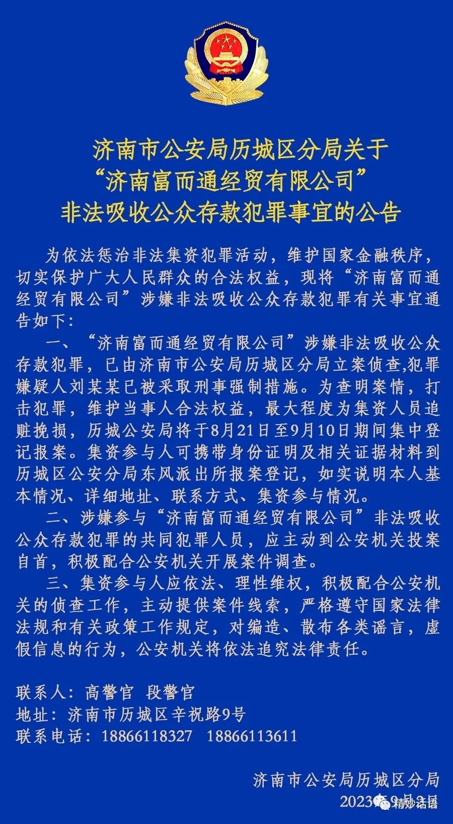 2023年9月2日,济南市公安局历城区分局对外发布了关于济南富而通经贸有限公司非法吸收公众存款犯罪事宜的公告。具体如下: