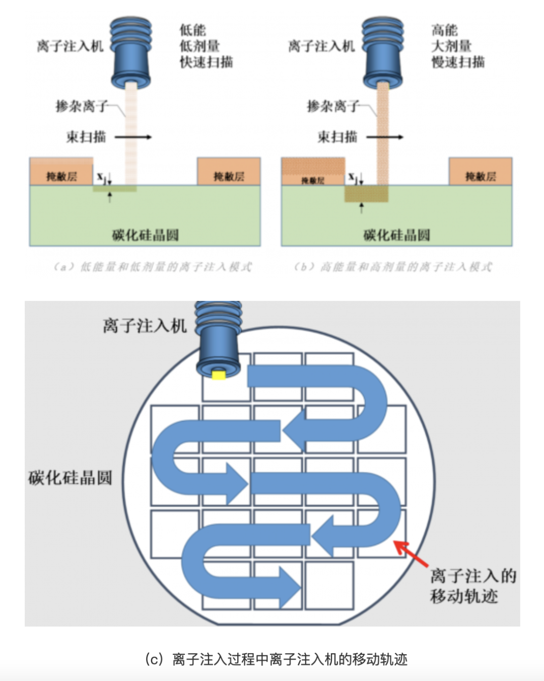 为达到离子注入区域掺杂浓度均匀的目的,工程师们通常采用多步离子注入的方式调整注入区域的整体浓度分布(如图3所示);在实际工艺制造过程中,通过调节离子注入机的注入能量和注入剂量,可以控制离子注入区域的掺杂浓度和掺杂深度,如图4.(a)和(b)所示;离子注入机在工作中通过在晶圆表面多次扫描方式对晶圆表面进行均匀离子注入,如图4.(c)所示。