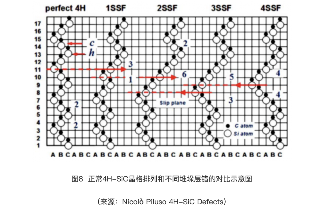 离子注入和随后的激活退火依旧不可避免地会产生降低器件性能的缺陷:复杂的点状缺陷、堆垛层错(如图8所示)、新的位错、浅或深能级缺陷、基面位错环和现有位错的移动。由于高能离子轰击过程会对碳化硅晶圆产生应力作用,高温高能离子注入工艺会增大晶圆翘曲度。这些问题也成为碳化硅离子注入和退火工艺制造环节中重要的环节。