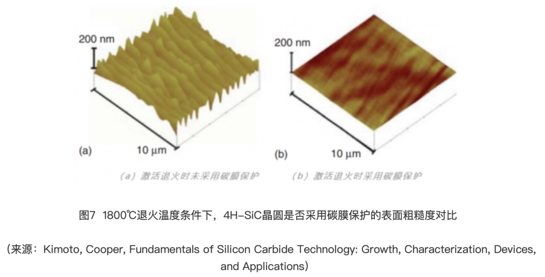 目前常用碳化硅离子注入后激活退火工艺在1600℃~1700℃温度下的Ar氛围中进行,使SiC表面再结晶并激活掺杂剂,提高掺杂区域的导电特性;退火前可在晶圆表面涂敷一层碳膜进行表面保护,减小Si脱附和表面原子迁移导致的表面退化,如图7所示;退火完成后,碳膜可以通过氧化或腐蚀方式去除。