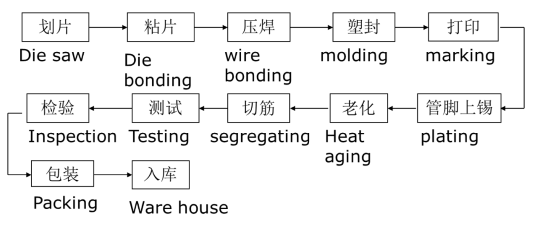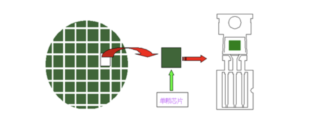 晶圆划片后,先将芯片放置、粘结到引线框架上,然后用金丝或铝丝将芯片上的电极与引线框架上的管脚连接起来,最后用注塑机将已装片的管子进行包封。塑料外壳可以保护芯片、增强电热性能,引线框架的管脚将源极、漏极、栅极都引出,方便之后的电路接线。