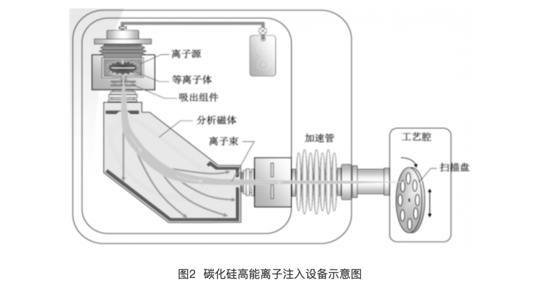 碳化硅工艺制造过程中使用的典型高能离子注入设备主要由离子源、等离子体、吸出组件、分析磁体、离子束、加速管、工艺腔和扫描盘组成,如图2所示。