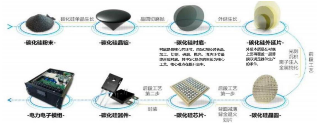 碳化硅⼀般是先被制作成晶锭,然后经过切片、打磨、抛光得到碳化硅衬底;衬底经过外延⽣长得到外延片。外延片经过光刻、刻蚀、离⼦注⼊、沉积等步骤制造成碳化硅晶圆。将晶圆切片,经过封装得到器件,器件组合在⼀起放⼊特殊外壳中组装成模组。