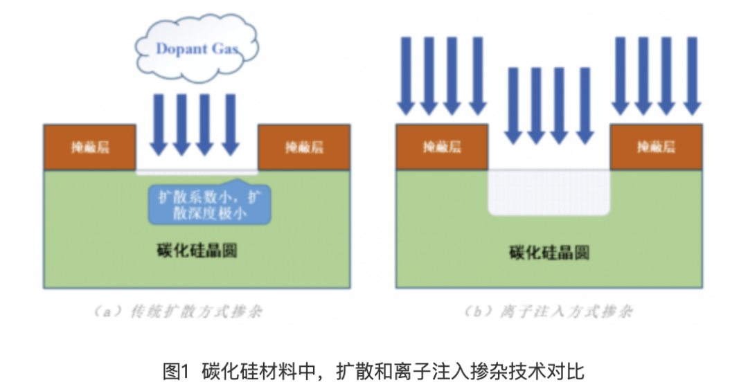 在功率半导体器件制造中,传统硅晶圆的P/N区掺杂可以采用扩散方式实现。但碳化硅中杂质原子的扩散常数极低,因此用扩散工艺实现选择性掺杂是不现实的,如图1所示。另一方面,离子注入的温度条件相对扩散工艺较低,同时可形成更加灵活和准确的掺杂分布。