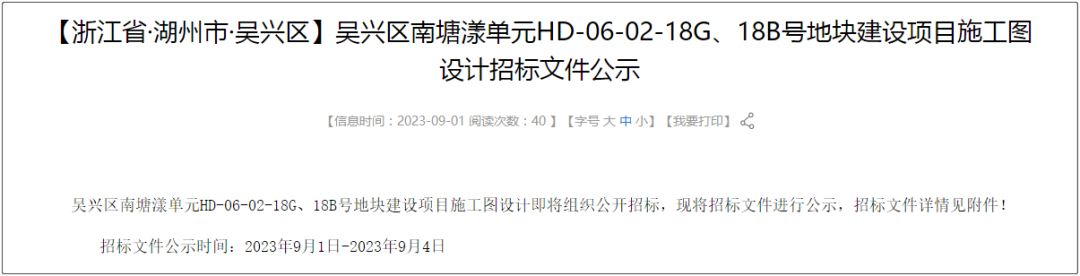 9月1日,吴兴区南塘漾单元HD-06-02-18G、18B号地块建设项目施工图设计招标文件公示