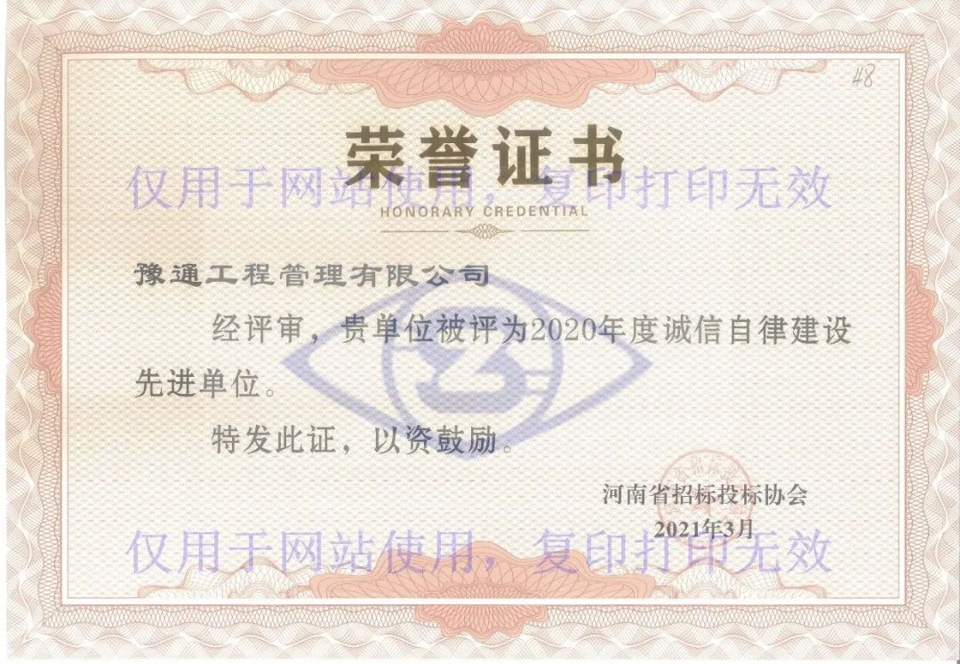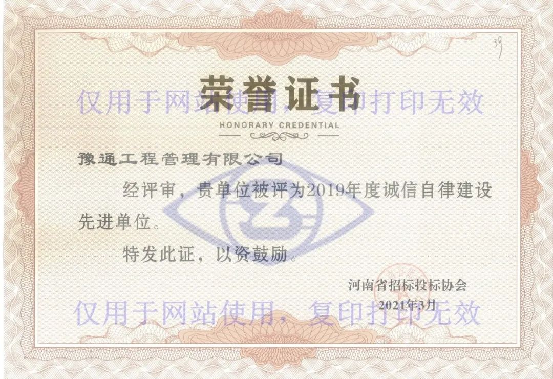 2021年3月25日,河南省招标投标协会颁发了《关于表彰2019年度河南省招标投标诚信自律建设先进单位的决定》和《关于表彰2020年度河南省招标投标诚信自律建设先进单位的决定》,我公司被评为2019年度及2020年度“诚信自律建设先进单位”。