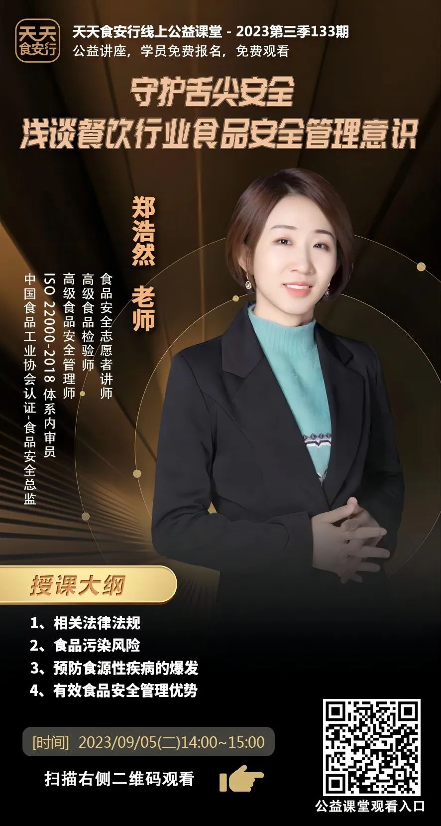 2023年09月05日下午14:00-15:00,天天食安行·公益大讲堂:邀请卫健委营养指导员、高级食品安全管理师、检验师 郑浩然老师,给大家分享《守护舌尖安全 — 浅谈餐饮行业食品安全管理意识》。点击下图长按“识别图中的二维码”,提前登记、预约直播课程。公益讲座,不收取任何费用。