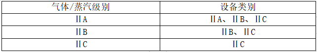 表2 气体/蒸气级别与设备类别的对应关系