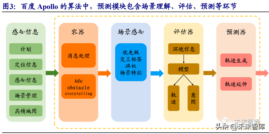 预测模块实际上是算法对外部环境和自车状态的理解。预测模块首先收集感知 模块输入的车道线、障碍物、红绿灯、地图、定位等信息对主车的状况进行判断。其次场景感知模块对外部障碍物的优先级、路权等外部环境对主车的影响进行感知。评估器则会根据场景信息和障碍物信息判断出障碍物的轨迹或意图。预测器则根据 短期的预测轨迹和意图判断障碍物等外部环境相对长期的轨迹。这将为未来汽车的 规划提供重要的参考。算法层面通常以 RNN 为主。