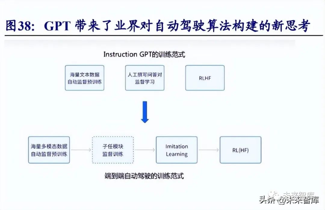 通识知识和强泛化能力助力人类轻松学会驾驶。人类可以在短时间内学会驾驶, 但机器则需要海量的数据和训练。可能的原因在于人类在学习驾驶之前就已经充分 对整个世界有了全面的认知,并可以将这些认识泛化到各类场景下。如在学校附近 应该减速、遇到老人应当小心等,面对形状怪异的红绿灯人类几乎不加思考就可理 解其想表达的意思。通识知识,强泛化能力可以对自动驾驶行为产生重大帮助。GPT 受到市场追捧,也引发了自动驾驶界对模型构建方式的思考。前文提到的 英国公司 Wayve 亦在尝试构建一个世界模型,通过使用与驾驶本身无关的数据,如 一些文本数据预训练模型进而提升模型的驾驶性能。此外,公司亦在尝试将自动驾 驶模型和自然语言结合,让自动驾驶模型能够描述自己的行为,进而增强模型的性能和可解释性。国内毫末智行等也在做出相应的尝试,建立大参数的模型,并将海 量驾驶场景编码成语料,投喂给模型进行无监督学习,接着再加入人类反馈强化学 习帮助其掌握驾驶员的行为,进而让模型拥有接近人的自动驾驶能力。大语言模型 的风靡也让市场对自动驾驶模型构建的方式有了新的想象空间,DriveGPT 未尝不是 一种可以尝试的方向。