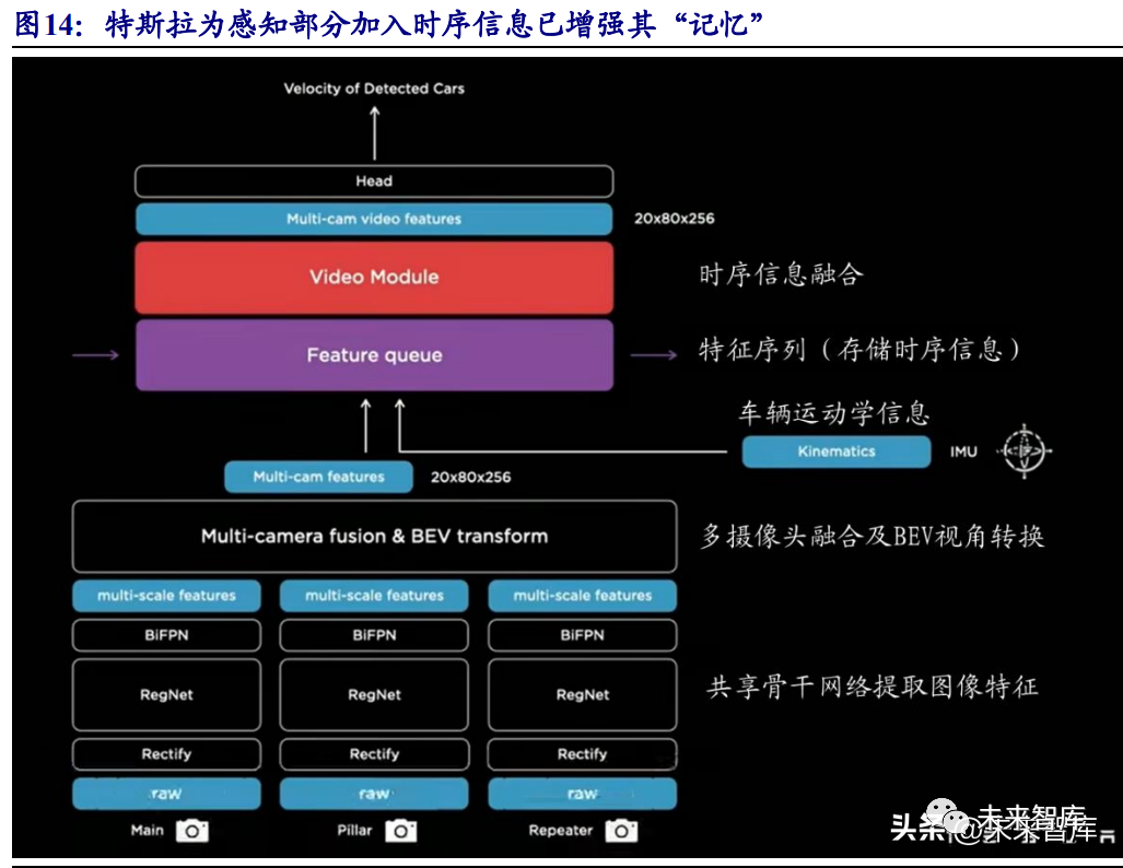 (2)加入时序信息,让算法拥有“记忆”:为了让自动驾驶算法拥有类似一段时间内“记忆”的能力,特斯拉在感知网络 架构中加入了时空序列特征层。通过引入惯性导航传感器获取的包含速度和加速度 等自车运动的信息,算法模型可获取时间和空间的记忆能力。具体而言,特斯拉给 算法加入特征队列模块(Feature Queue),他会缓存一些特征值(包含历史帧的 BEV 特征、惯导传感器信息等),便于了解车辆行动,这个序列包含时间和空间记忆。然 后引入视频模块(Video Module)使用空间循环神经网络(Spatial RNN)/transformer 等算法将前述缓存的特征进行融合,关联前后时刻信息,使得模型具有记忆能力, 让自动驾驶汽车将同时能够记住上一段时间和上一段位置的检测信息。