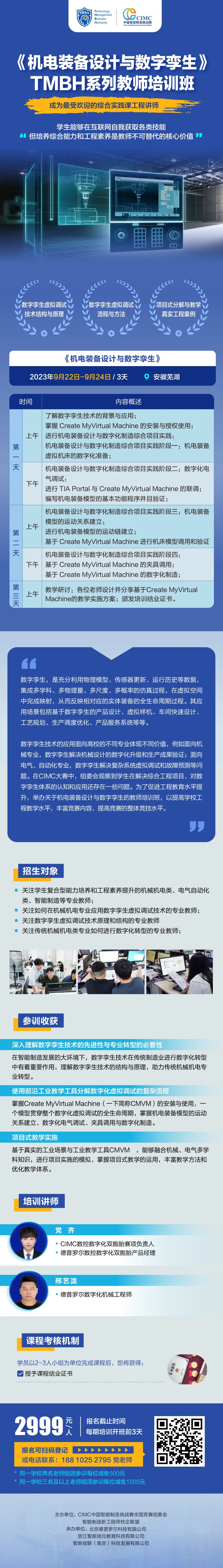 为协助各高校传统机械机电类专业转型,迈向智能制造,改进综合教学体系,培养学生解决复杂综合项目的能力与项目交付能力,助力专业工程认证和“新工科”、“微专业”建设,智能制造新工程师校企联盟、CIMC 中国智能制造挑战赛联合开展《机电装备设计与数字孪生》系列培训班。