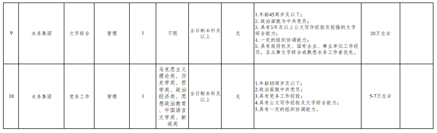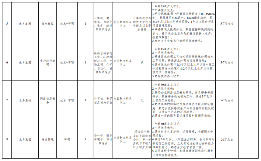 招聘岗位、人数水工艺工程人员1名;自动化硬件工程管理人员1名;电气工程管理人员1名;项目建设人员1名;信息数据管理人员1名;生产运行管理人员1名;网络信息安全管理人员1名;财务管理人员1名;文字综合管理人员1名;党务工作人员1名。