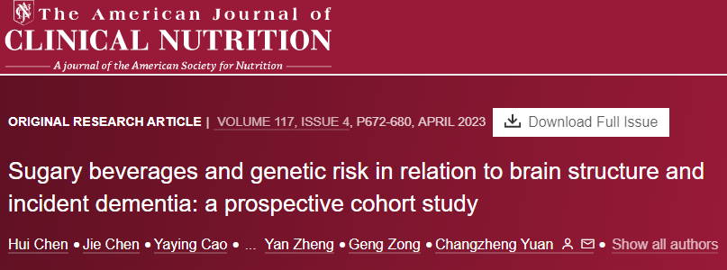 近日,浙江大学医学院附属第二医院袁长征教授联合清华大学、复旦大学、哈佛大学的研究人员在《美国临床营养学杂志》上发表了一篇题为" Sugary beverages and genetic risk in relation to brain structure and incident dementia:a prospective cohort study "的研究论文。