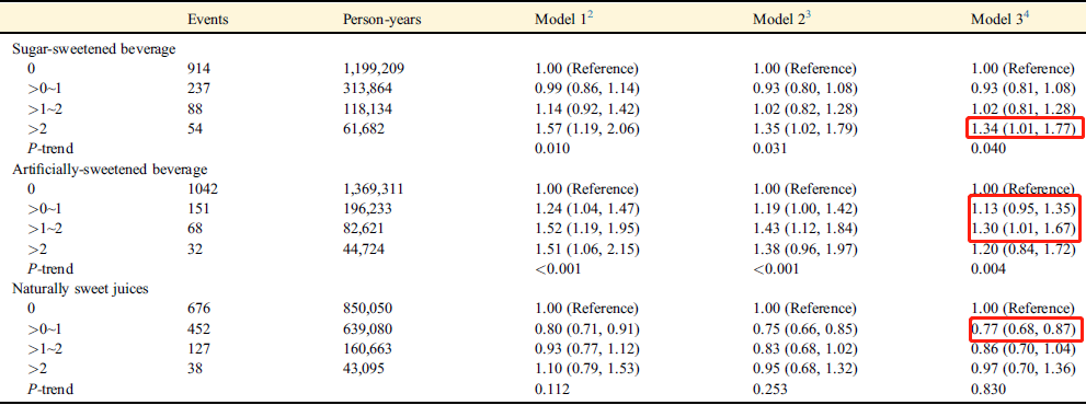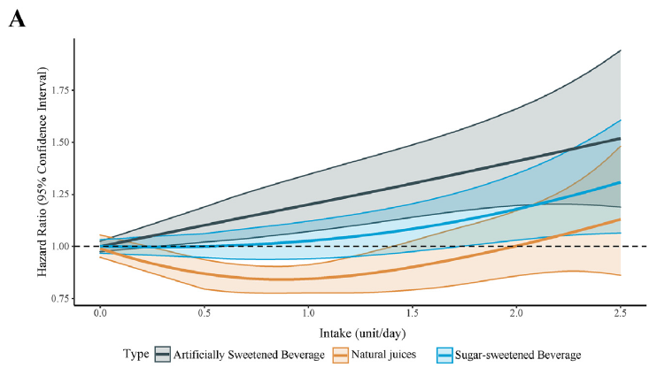 这表明,与遗传风险无关,摄入较多的SSB和ASB与较高的痴呆风险相关,而适度摄入天然果汁与较低的痴呆风险相关。