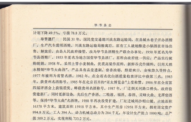 据毕节县志记载毕节酒厂成立于1942年,民国政府川滇东路运输管理局整合毕节酿酒作坊,成立毕节酒精厂生产汽车燃料酒精支援抗战,1953年改制为国营毕节县酒厂,经典产品毕节大曲1977年被列为省管名酒,83、86年两次荣获贵州名酒称号,是贵州老八大名酒之一。