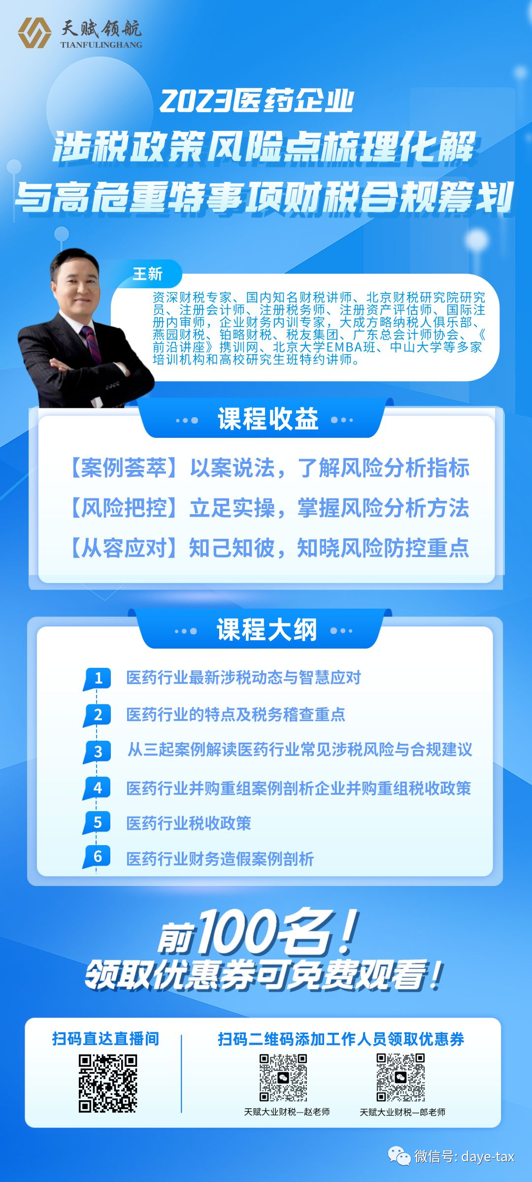 王老师对医药行业涉税政策进行了研究及风险点进行了梳理,发现优惠不少,风险更多!本课程结合现行政策法规及典型案例,分析并总结医药行业涉税风险点,从而为医药企业提出税务合规筹划建议,助力其健康发展。