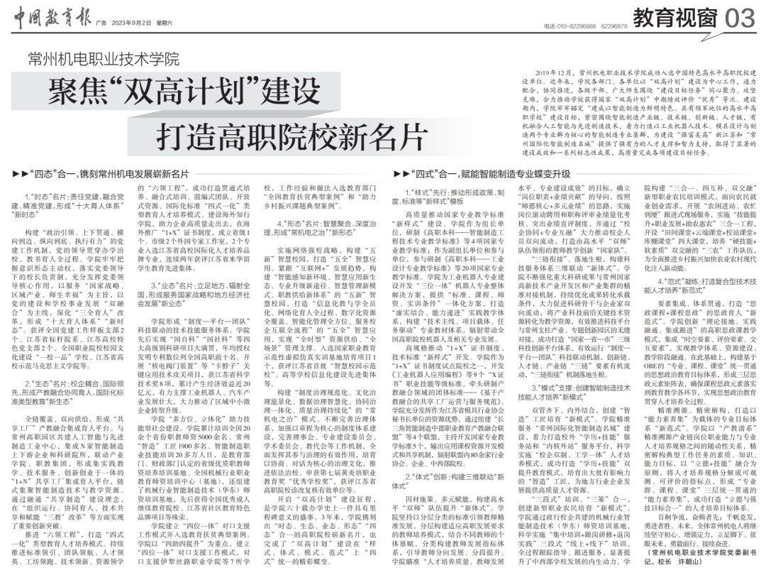 2019年12月,常州机电职业技术学院成功入选中国特色高水平高职院校建设单位。近年来,学院各部门、各单位以“双高计划”建设为中心工作,通力配合、协同推进,各级干部、广大师生围绕“建设目标任务”同心聚力、攻坚克难,合力推动学校获得国家“双高计划”中期绩效评价“优秀”等次。建设期内,学院牢牢锚定“建成以智能制造为鲜明特色、具有领军地位的高水平高职学校”建设目标,紧密围绕智能制造产业链、技术链、创新链、人才链,有机融合人工智能与先进制造技术,着力打造以工业机器人技术、模具设计与制造两个专业群为核心的智能制造专业集群,为建设“强富美高”新江苏和“常州国际化智能制造名城”提供了强有力的人才支撑和智力支持,取得了显著的建设成效和一系列标志性成果,高质量完成各项建设目标任务。
