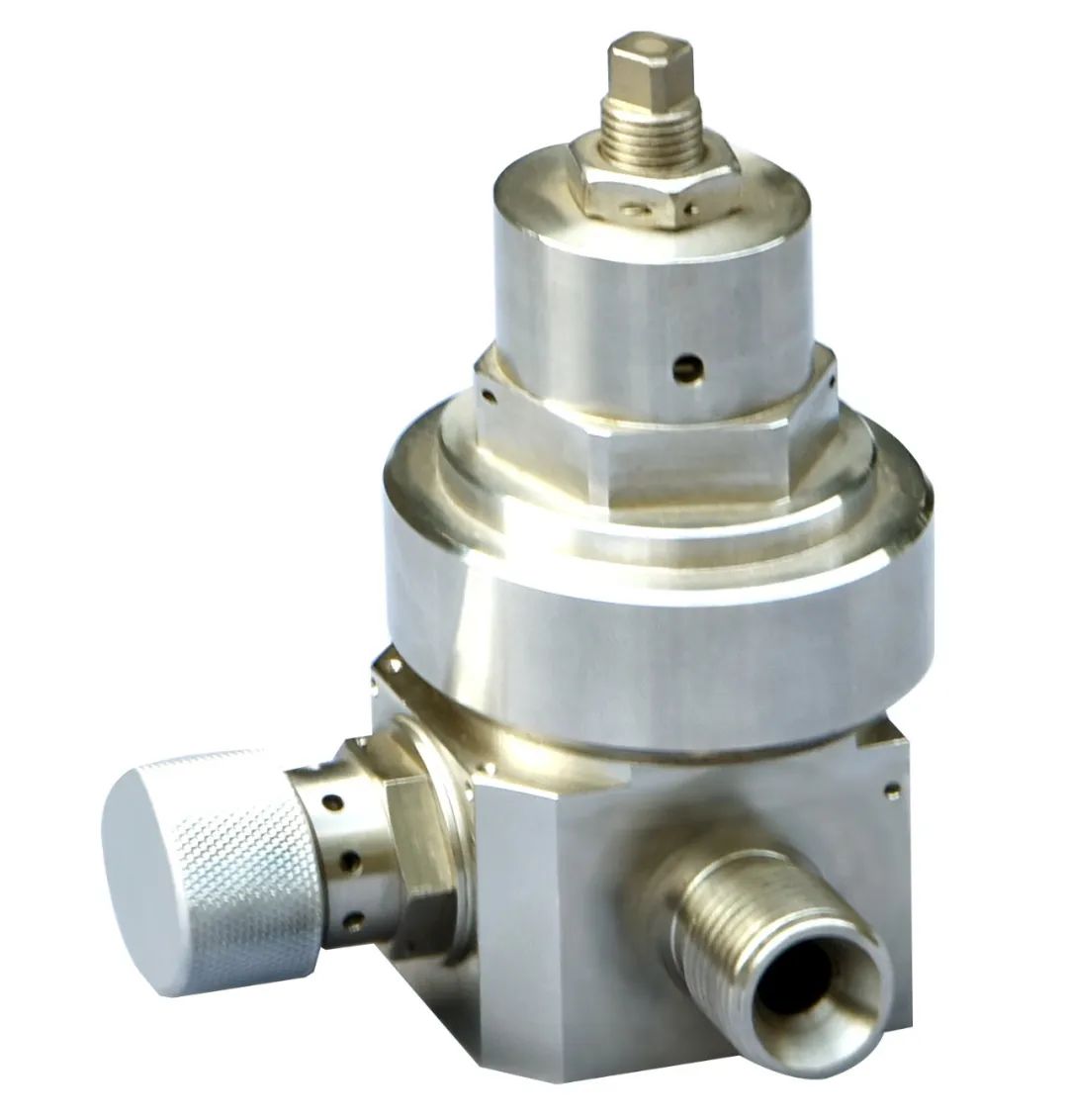 减压阀由阀体、阀芯、外壳、调节螺钉、弹簧、膜片、密封垫、过滤网、安全阀等组成。利用介质能量,推动弹簧运动,实现出口压力稳定。通过调节螺钉,将进口压力减压阀减至某一需要的出口压力,并依靠介质本色的能量,使出口压力保持稳定的阀门。其工作压力为7~30MPa,出口压力为3~5.5MPa,最大流量为600L/min。广泛用于出口压力要求稳定的系统中。