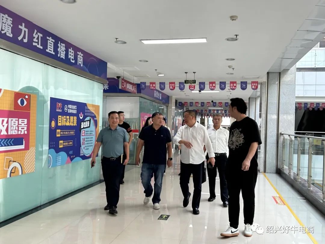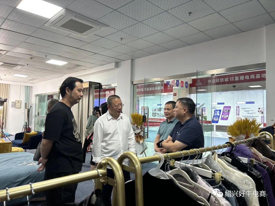9月1日下午,省电子商务促进中心主任戴伟龙一行调研中国轻纺城服装市场直播电商基地,绍兴市商务局、柯桥区商务局领导陪同,杭州好牛集团总经理丁建军、绍兴好牛总经理助理俞琦斌及基地商户代表共同接待。