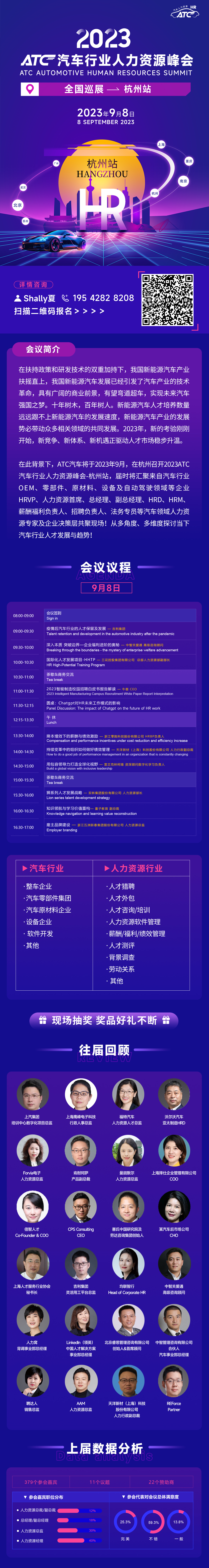对此,我们将于2023年9月8日在杭州举办《2023ATC汽车行业人力资源峰会》,围绕新四化汽车时代对研发人才、营销人才、技能人才的升级要求,就传统汽车人才如何转型升级、人才保留及发展、如何助力汽车人效提等热点话题进行深度探讨。