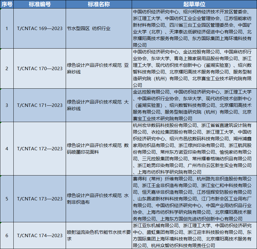 发布的6项标准为绿色园区、绿色设计产品及节能标准,由中国纺织工业联合会归口组织,分别由中国纺织经济研究中心、金达控股有限公司、杭州宏华数码科技股份有限公司、赛得利(常州)纤维有限公司、浙江亚东机械有限公司等单位牵头,相关企业共同参与起草制定。