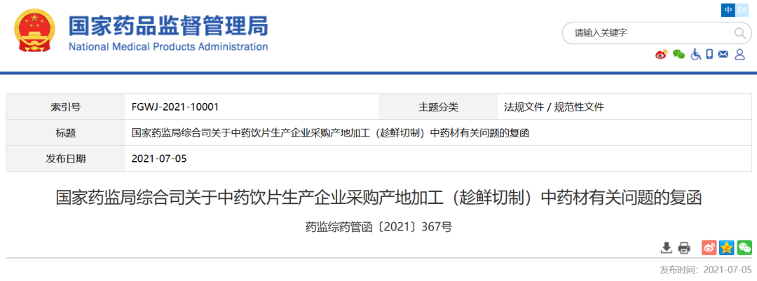 鲜切药材目录、趁鲜切制加工指导原则及其制定的关键过程等信息应当通过官方网站等方式及时公开,接受社会监督。