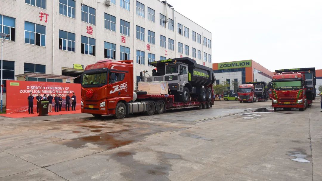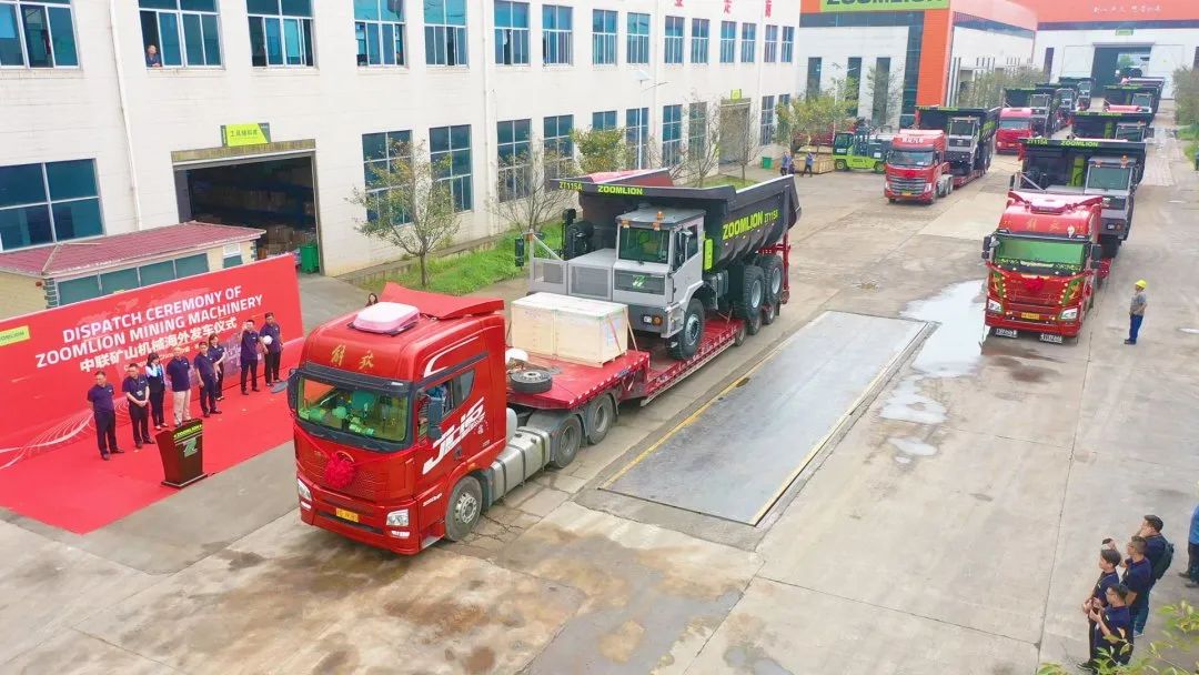 金秋九月,中联重科矿山机械设备海外订单批量发车仪式在矿山机械园区隆重举行。随着一声“发车”的指令,汽笛响起,在震耳的鞭炮声中,一批闪耀着极光绿的中联矿卡缓缓驶出,发往海外。中联重科矿山机械事业部干部职工、中联重科海外公司的代表共百余人参加了发车仪式。