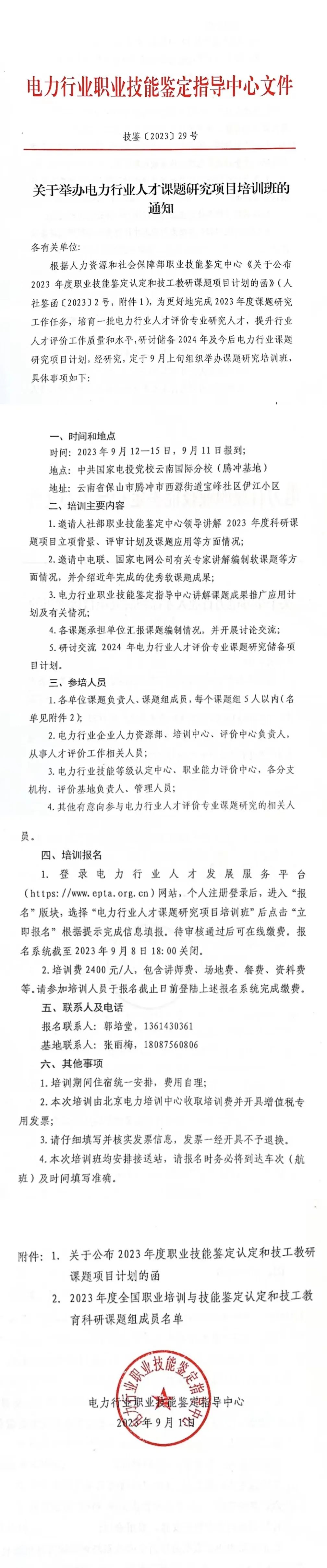 根据人力资源和社会保障部职业技能鉴定中心《关于公布2023年度职业技能鉴定认定和技工教研课题项目计划的函》(人社鉴函[2023]2号,附件1),为更好地完成2023 年度课题研究工作任务,培育一批电力行业人才评价专业研究人才,提升行业人才评价工作质量和水平,研讨储备 2024 年及今后电力行业课题研究项目计划,经研究,定于 9月上旬组织举办课题研究培训班,具体事项如下