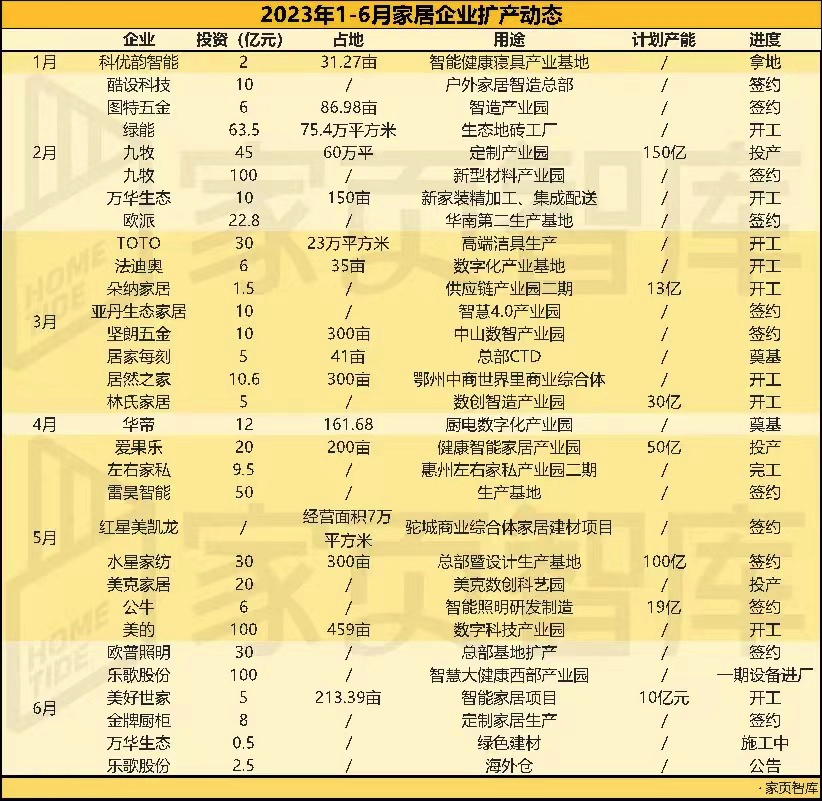 据家页智库,家居行业上半年产能扩张图,超30家企业正在或者已经扩张生产基地。