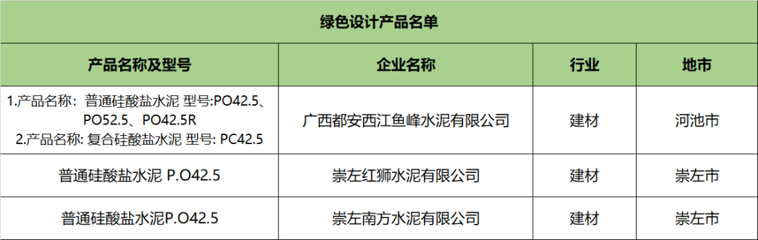 广西都安西江鱼峰水泥有限公司的普通硅酸盐水泥PO42.5、PO52.5、PO42.5R和复合硅酸盐水泥PC42.5,崇左红狮水泥有限公司的普通硅酸盐水泥PO42.5,崇左南方水泥有限公司的普通硅酸盐水泥PO42.5获评绿色设计产品名单。