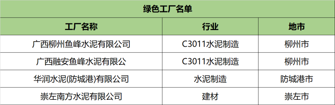 其中,广西柳州鱼峰水泥有限公司、广西融安鱼峰水泥有限公司、华润水泥(防城港)有限公司、崇左南方水泥有限公司获评绿色工厂。