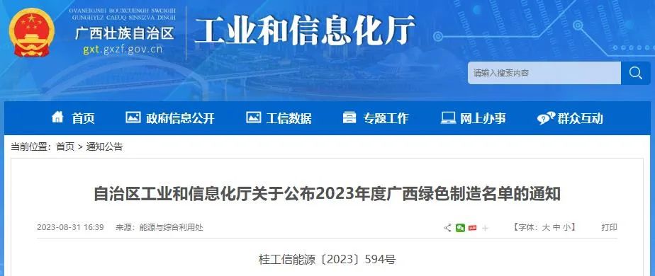 近日,广西壮族自治区工信厅公布2023年度广西绿色制造名单。