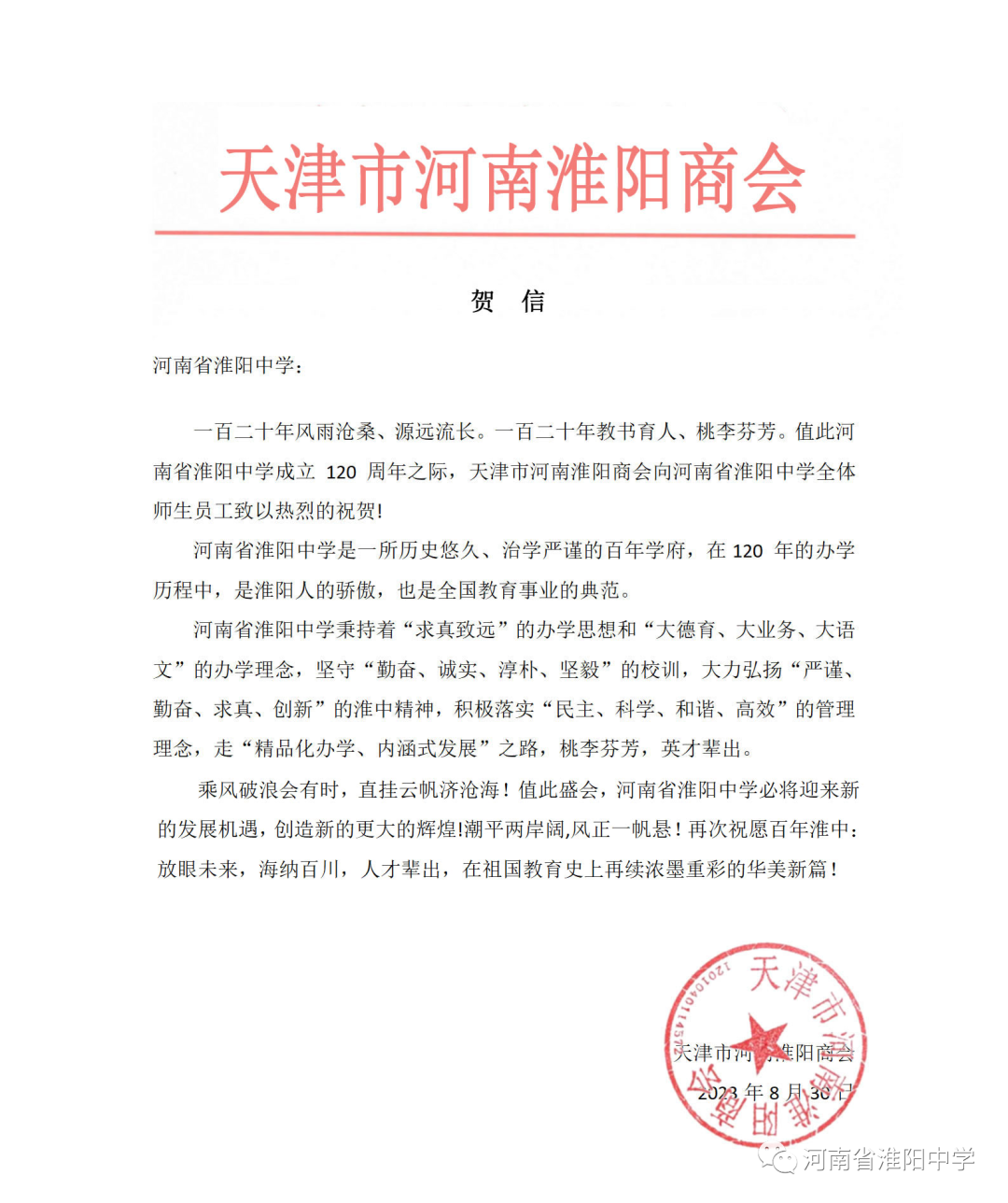 一百二十年风雨沧桑、源远流长。一百二十年教书育人、桃李芬芳。值此河南省淮阳中学成立 120 周年之际,天津市河南淮阳商会向河南省淮阳中学全体师生员工致以热烈的祝贺!