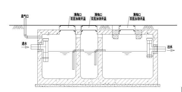 化粪池在生活污废水处理过程中可视为污染物初级处理系统,其原理是沉淀和厌氧微生物发酵。生活污水中比重大的颗粒物质沉降(形成沉渣),比重小的物质上浮(形 成浮渣);利用微生物厌氧发酵作用使粪便等有机物被初步降解,实现污水的初级处理。
