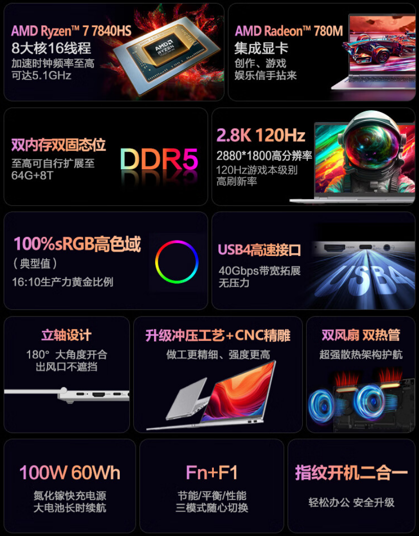 配置方面,这款笔记本搭载了 R7 7840HS 处理器,8核16线程,最大加速频率5.1GHz,780M核显,TS跑分2900上下;双风扇双热管,支持 54W 性能释放,拥有双 DDR5 内存条插槽和双 M.2 2280 PCIe 4.0 SSD 盘位,可升级。